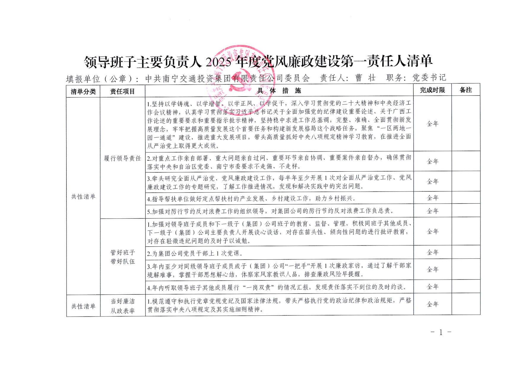 南寧交投集團(tuán)領(lǐng)導(dǎo)班子主要負(fù)責(zé)人2025年度黨風(fēng)廉政建設(shè)第一責(zé)任人清單