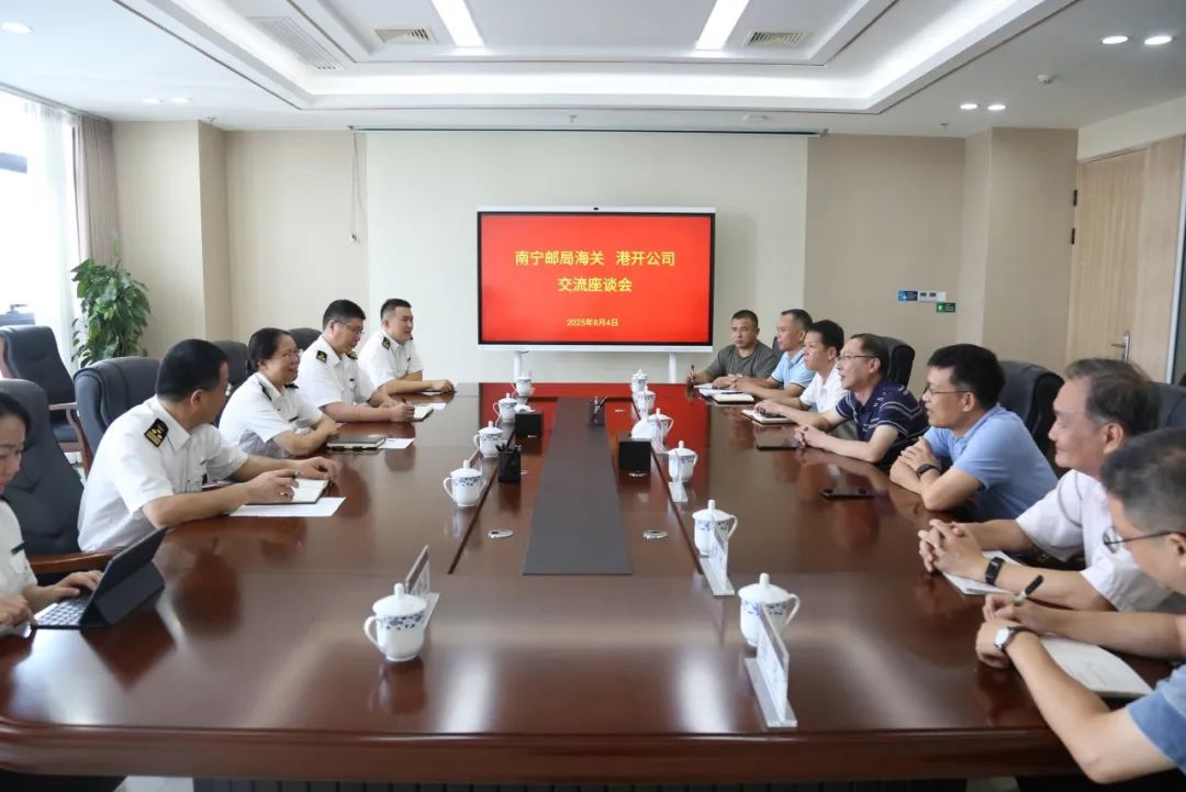 南寧郵局海關(guān)副關(guān)長(zhǎng)李良、余泳,南寧交投集團(tuán)副總經(jīng)理、港開(kāi)公司副董事長(zhǎng)周宏,港開(kāi)公司副總經(jīng)理藍(lán)澄、陳志杰及雙方有關(guān)部門負(fù)責(zé)人參加座談。(港開(kāi)公司 覃燕春)